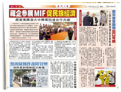 10月23日的澳门日报,以《藏企参展MIF促民族经济》进行了报道。
