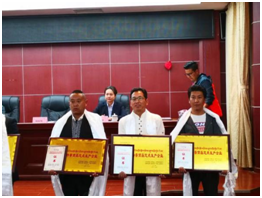 索朗次旺副总经理领取证书及牌匾 全国民族特需商品定点生产企业证书