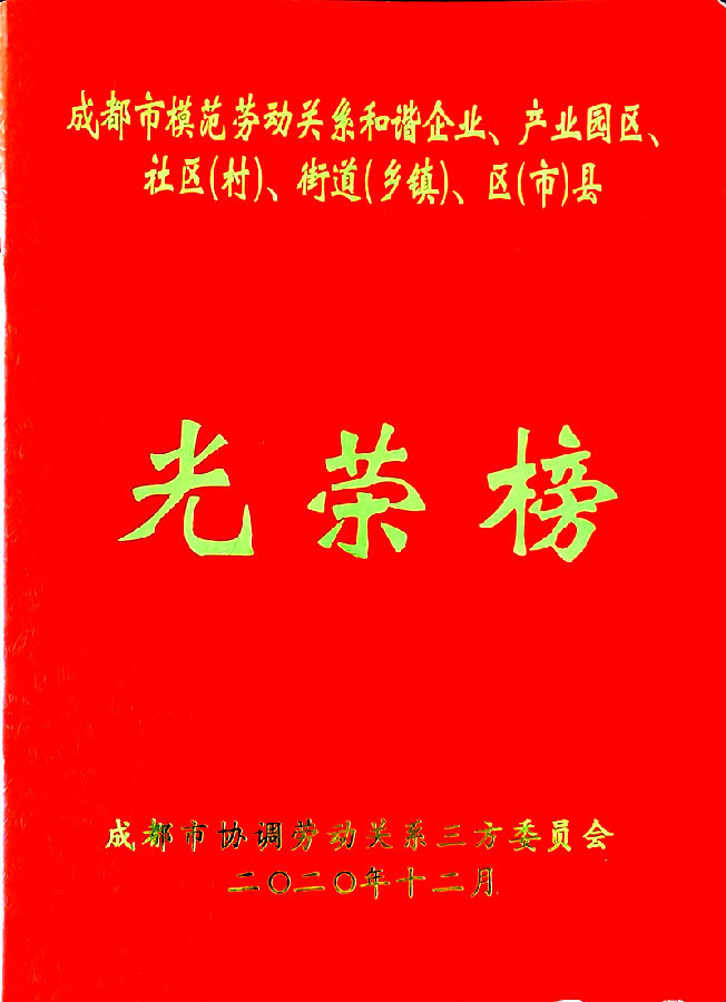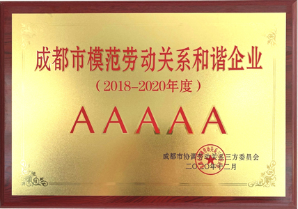 2020年12月2日,在成都市协调劳动关系三方委员会认定下,我司成都分装厂荣获“2018-2020年5A级成都市模范劳动关系和谐企业”称号。2021年3月23日在成都市温江区人力资源和社会保障局指导的“构建和谐劳动关系宣传月”活动中授予牌匾及光荣榜证书。此殊荣为成都市企业界评定模范劳动关系的最高荣誉。